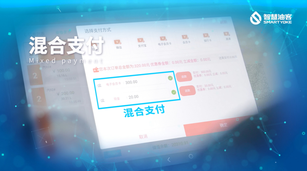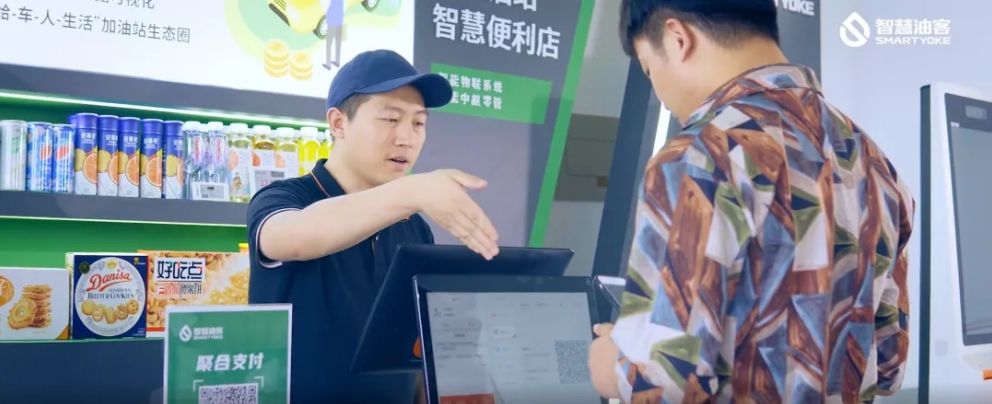 加油站可通过智慧油客智慧支付系统实现油品与非油品扫码即付、一键结算、多种支付方式混合支付以及线上开票等功能;甚至可以通过自助收银大屏让顾客享受无需排队自助结账服务,避免多次操作付款和排队付款、开发票情况,降低车主在加油站“购物”的时间成本。
